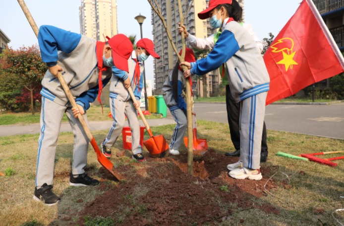 同样,龙马潭区望山坪社区里,鱼塘学校五年级的孩子们正在开展植树活动。活动现场,孩子们热情饱满,干劲十足,在老师的指导下迫不及待地拿起铁铲“开工”。