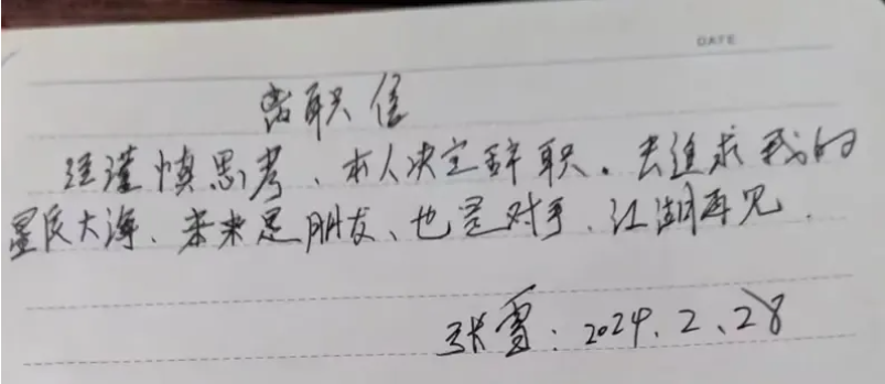 △张雪的辞职信:“本人决定辞职,去追求我的星辰大海。”