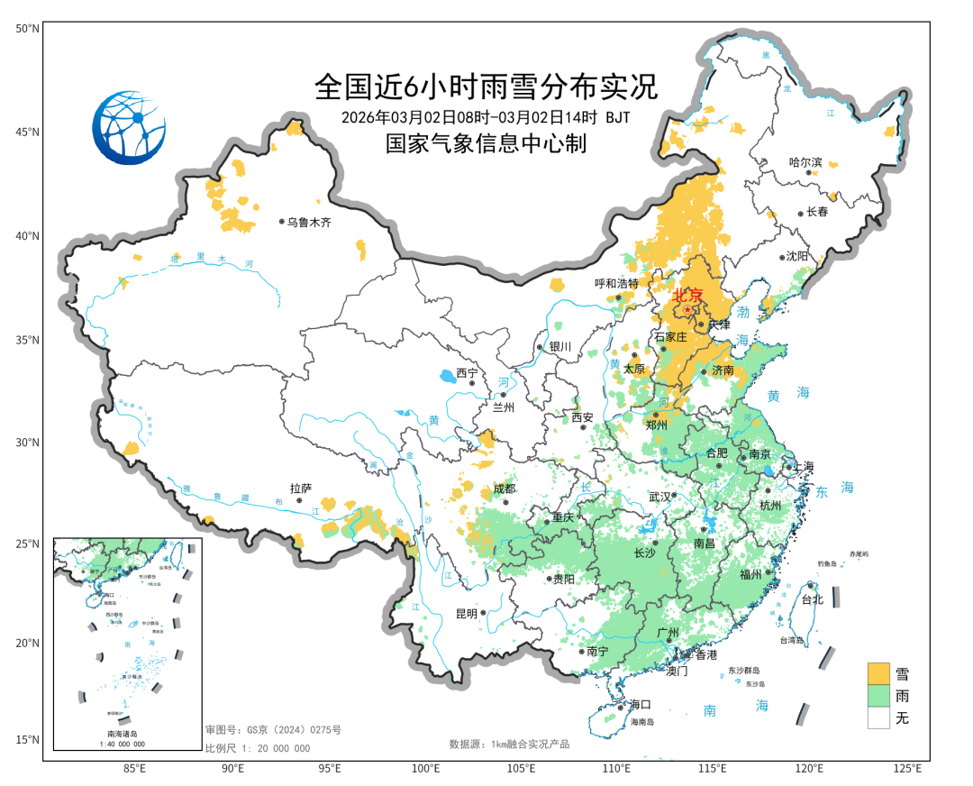 今天,随着冷空气南下,暖湿气流有所减弱,我国的雨雪天气也开始减弱,并分为南北两片区域。8至14时,华北一带出现降雪,华南一带出现对流降雨,其中广西东部和广东西部出现了单小时20毫米以上的短时强降雨。