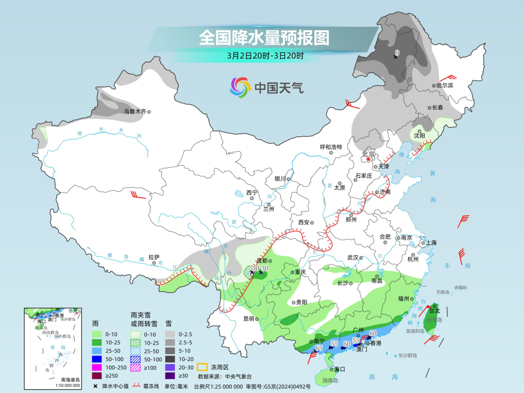 明天,雨雪天气将进一步减少、减弱。北方的雪主要在内蒙古东部、东北地区,以小到中雪为主,内蒙古、黑龙江交界一带或现大雪。南方的雨也将向南收缩减弱,不过在广东南部、广西南部等部分地区仍有中到大雨。