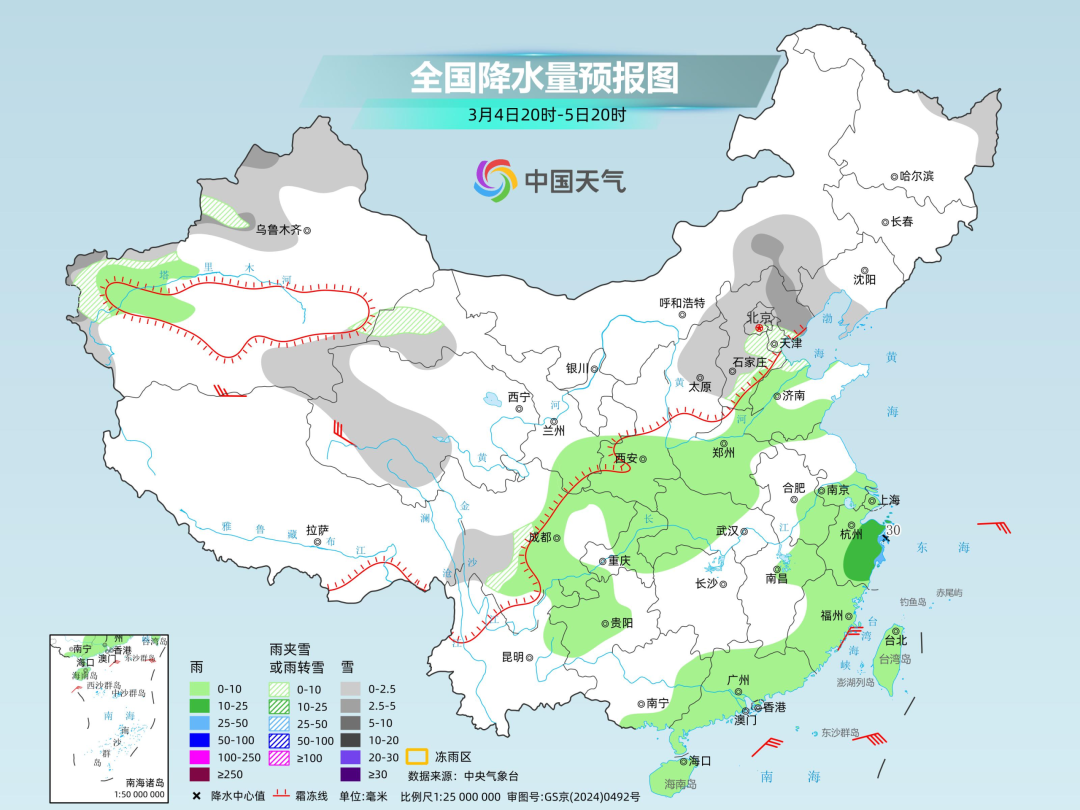3月4日至5日,随着高空槽东移,南北方都会有降水出现。山西、河北、北京、天津等部分地区可能出现降雪或雨夹雪,江西、安徽、浙江、福建、广东等地依然有些阴雨天气。