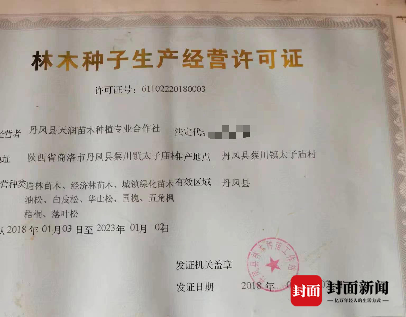 合同上有村委会、合作社、蔡川镇人民政府三方盖章。承包土地信息一页上,有丹凤县农业局盖章。合作社还办理了林木种子生产经营许可证,由丹凤县林木种苗工作站盖章签发。