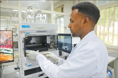 在埃塞俄比亚农业部下属的动物产品和投入品质量检测中心,质量分析师法努埃尔正在进行样本检测。 本报记者 沈小晓摄