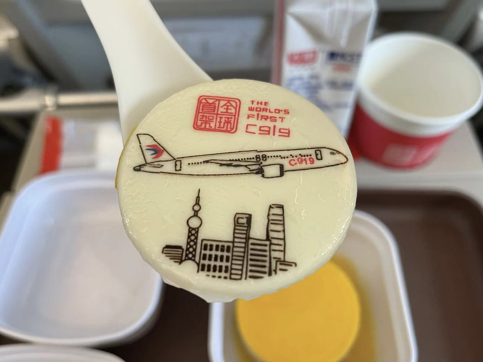 他还拿出手机给记者看他在飞机上的伙食。“吃得很好,水果、牛奶、面条都很美味,但我最喜欢的还是甜点,是特制的布丁,上面印有‘C919’的图案和字样,我还有点舍不得吃。”