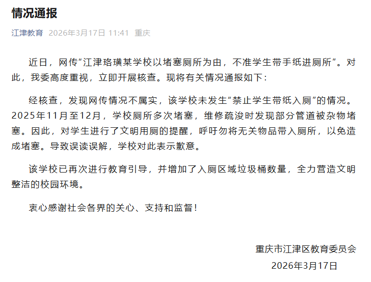 3月17日上午,重庆市江津区教育委员会发布情况通报称,经核查,发现网传情况不属实,该学校未发生“禁止学生带纸入厕”的情况。