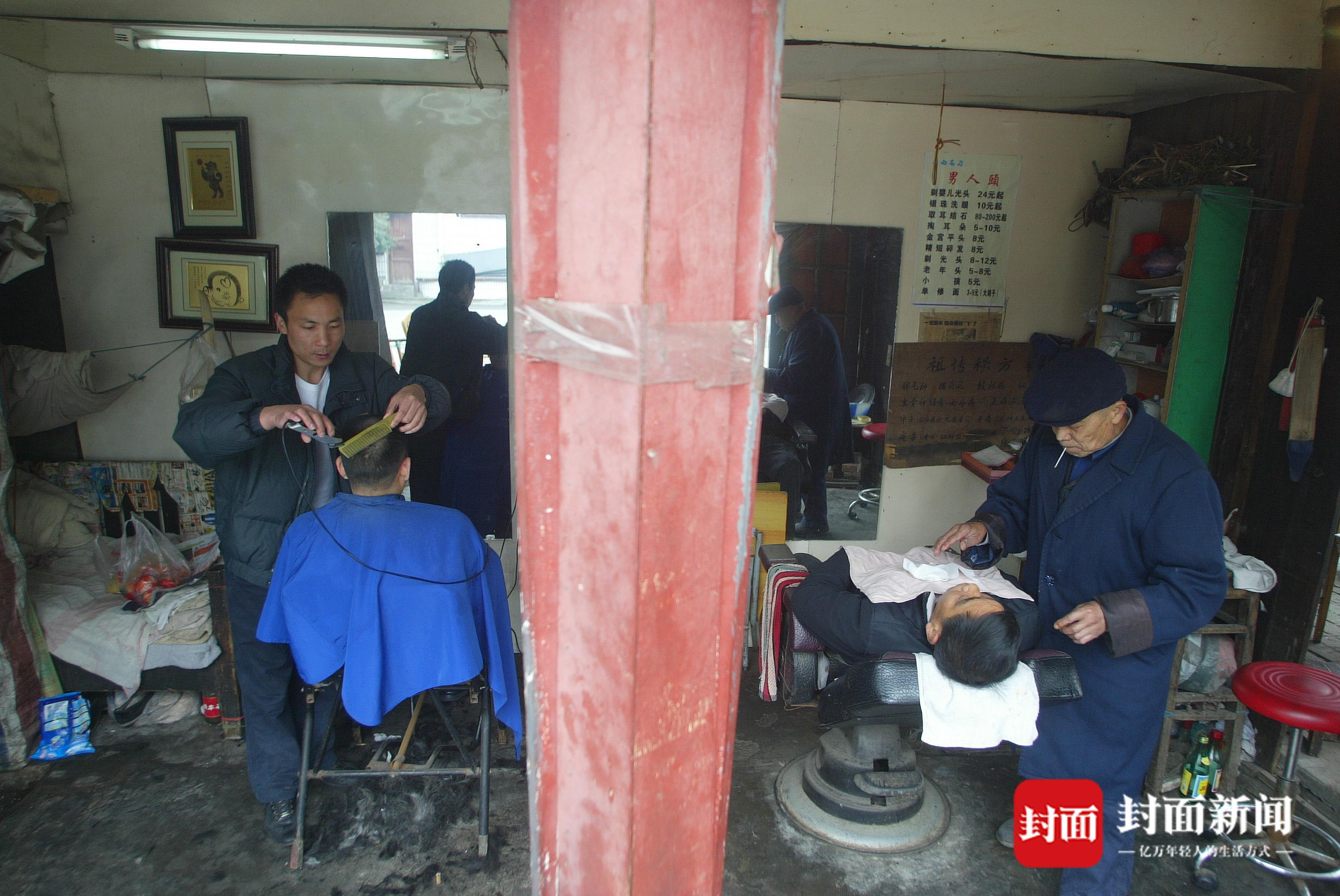 2008年3月,陈建宗(左)和父亲一起在理发店为客人理发。