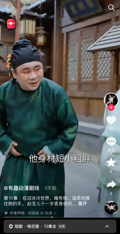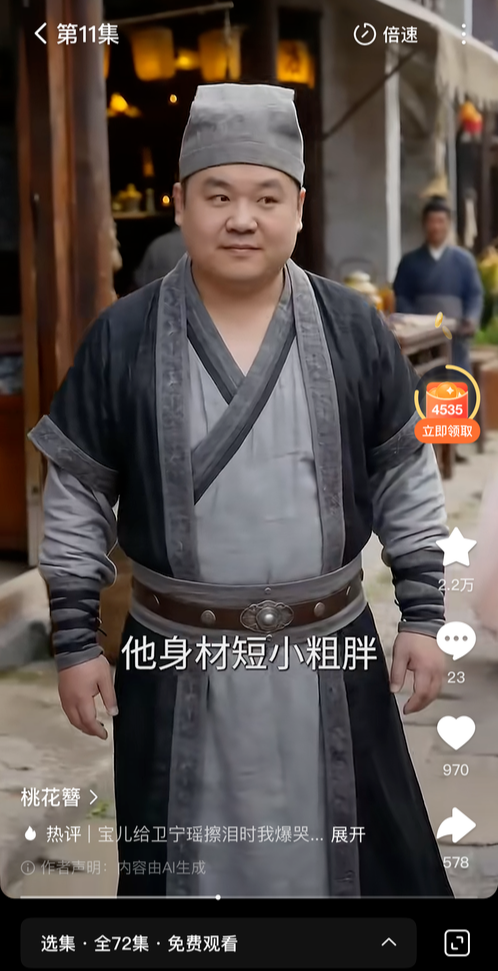 短剧App显示,这部名为《桃花簪》的短剧有“4054万热度”,共72集。其中第11集中,一个“身材短小粗胖,平日游手好闲还好色”的角色刘大确实和白先生此前发布的汉服妆造图高度相似。