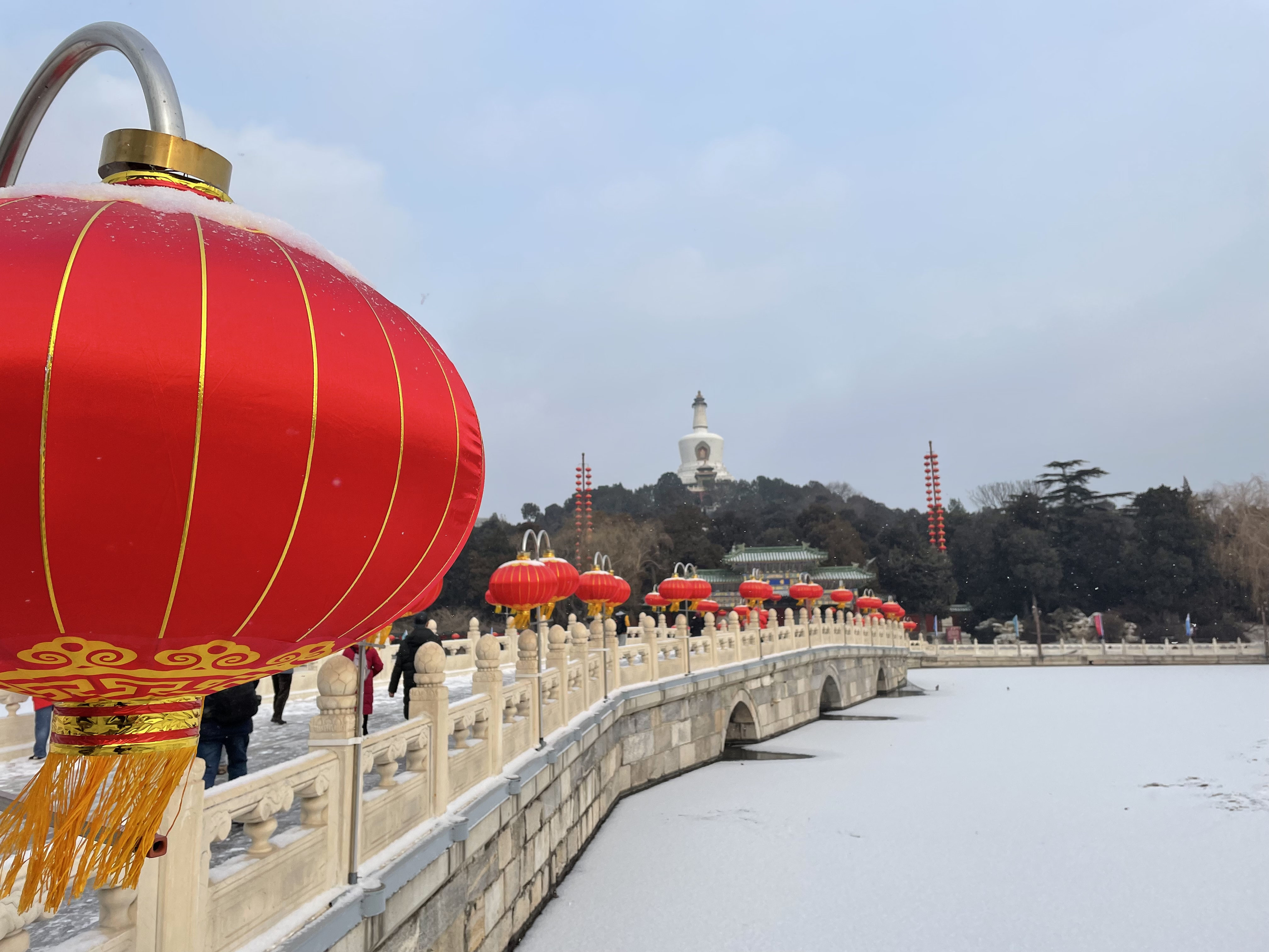 北京北海公园内大红灯笼与皑皑白雪相映成趣。(北京市公园管理中心供图)