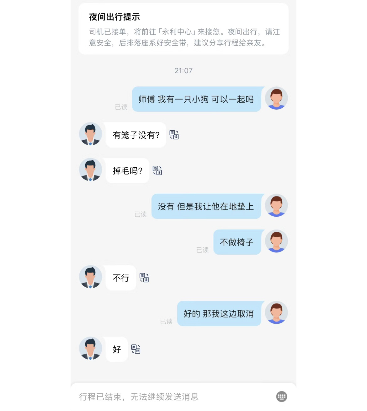 婷婷谈到,6辆车中有5辆车的司机态度坚决表示不搭载宠物,遂无责取消订单;有一辆车在电话沟通后允许宠物上车,抵达后看到狗狗实体,以“体型过大”“毛发太多”为由自行取消订单,扬长而去,留下婷婷一人“风中凌乱”。