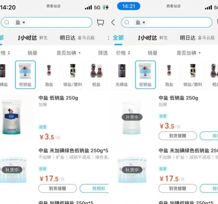 8月24日中午,记者查看生鲜电商平台发现,多个平台的低钠盐、无碘盐显示“缺货” “补货中”。