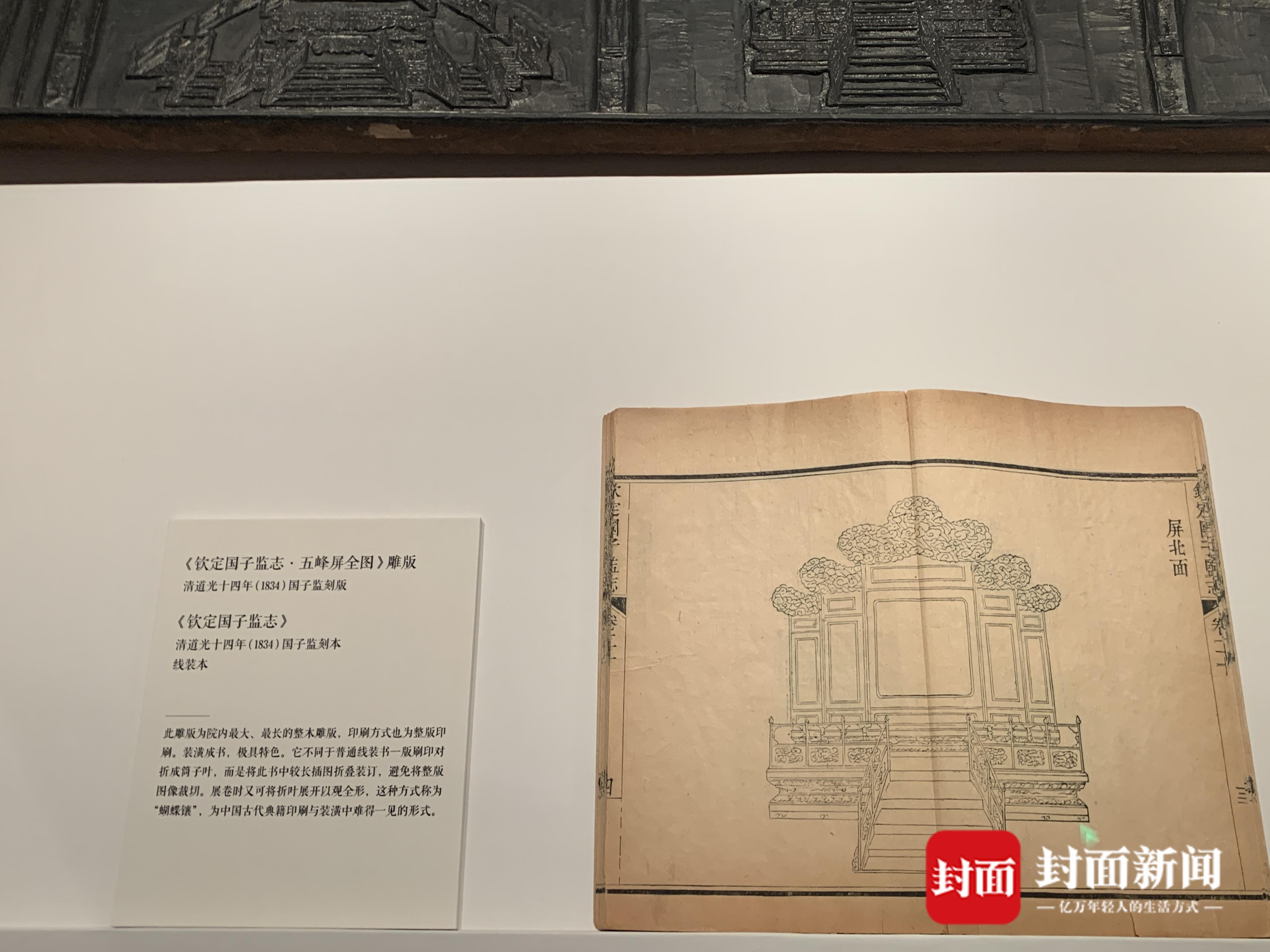 展厅还展出了内府刻书技艺,讲述了内府刻书衰落的历史原因。《钦定国子监志·五峰屏全图》雕版为院内最大、最长整木雕版,印刷方式也为整版印刷。不同于普通线装书一版刷印对折成筒子页,而是将书中较长插图折叠装订,避免将整版图像裁切,展卷时又可将折页展开以观全形。这种方式称为“蝴蝶镶”,为古代典籍印刷与装潢中难得一见的形式。