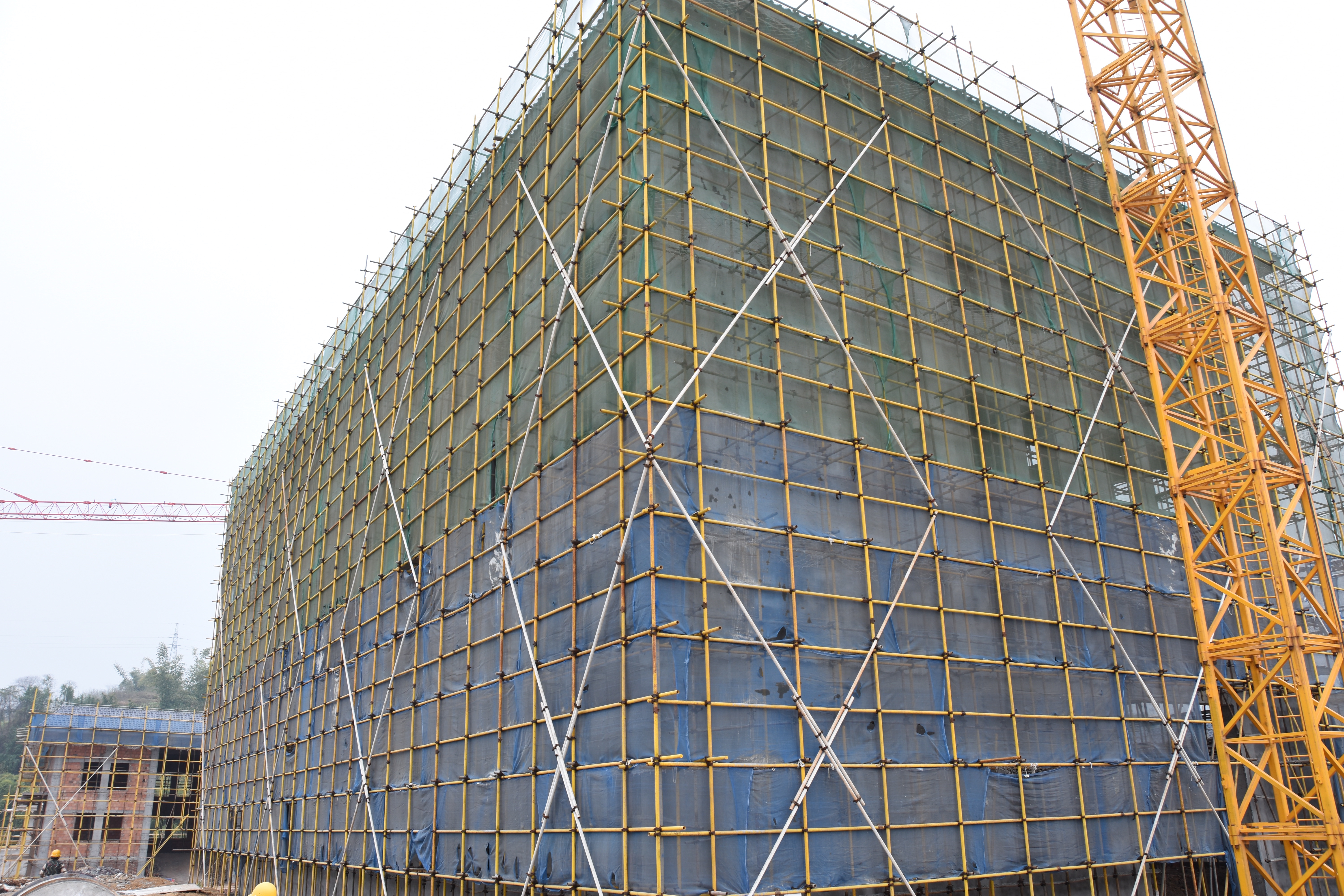 在现场,有的工人正在为建筑物进行外装,有的正在为外墙抹灰浆,有的正在做主体建筑的收尾工作,一派繁忙的建设景象。