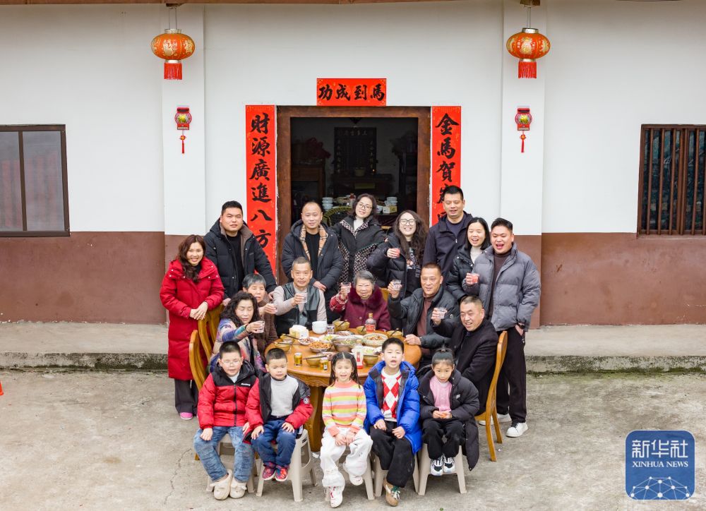 ↑ 2月16日,在四川省南充市顺庆区清平村,村民陈俊尧一家祖孙四代吃团年饭。新华社发(彭珉翔 摄)