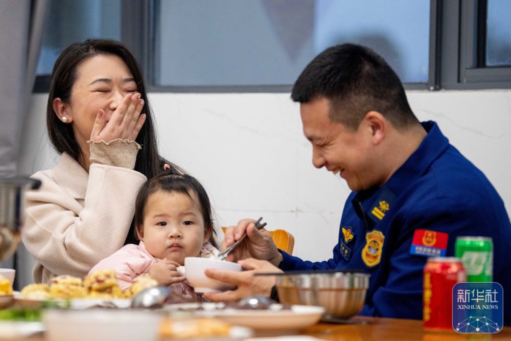 ↑ 2月16日,在江苏省泰兴市澄江西路消防救援站,消防员和家属一起吃团圆饭。新华社发(杨玉岗 摄)