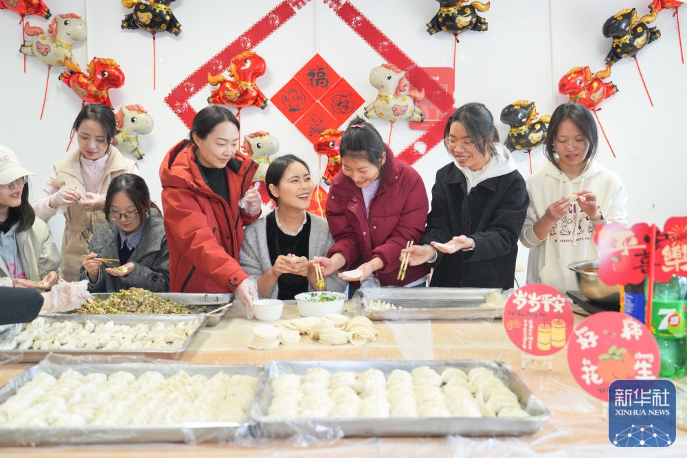 ↑ 2月16日,在重庆西南大学,工作人员和留校学生组成“临时家庭”一起包饺子庆新春。新华社发(秦廷富 摄)