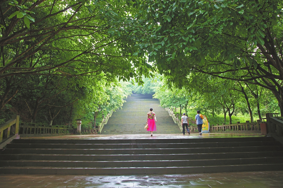 层林尽染,山泉潺潺,蛙鸣鸟叫,站在西山风景区海拔480.7米的栖乐山主峰俯瞰南充城区,都市繁华尽收眼底。