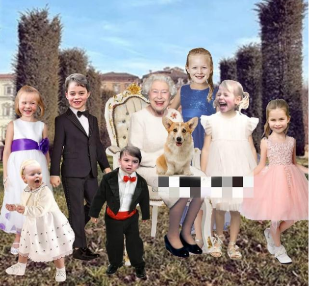 除此之外,有网友甚至还P出了女王的生日合照,照片中,女王被她重孙子辈的孩子们围绕起来,面带笑容真的超开心了。