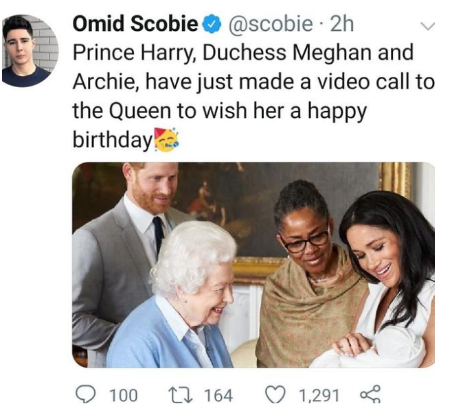 据梅根哈里的一位发言人说,远在美国的梅根与哈里带着儿子小阿奇一起给女王进行了视频通话,祝她生日快乐。