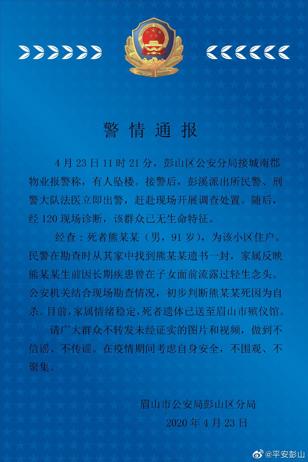 4月23日下午,眉山市公安局彭山区分局发布警情通报称,4月23日11时21分,彭山区公安分局接城南郡物业报警称,有人坠楼。接警后,彭溪派出所民警、刑警大队法医立即出警,赶赴现场开展调查处置。随后,经120现场诊断,该群众已无生命特征。