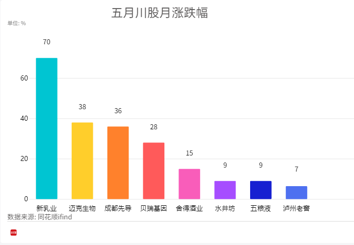 消费股作为拉动经济的一大支撑,整个5月的市场表现是可圈可点的。四川的重点支柱行业之一的白酒,股市表现赢得利好。舍得酒业以15%涨幅领涨,水井坊、五粮液、泸州老窖分别以9%、9%、7%跟涨。