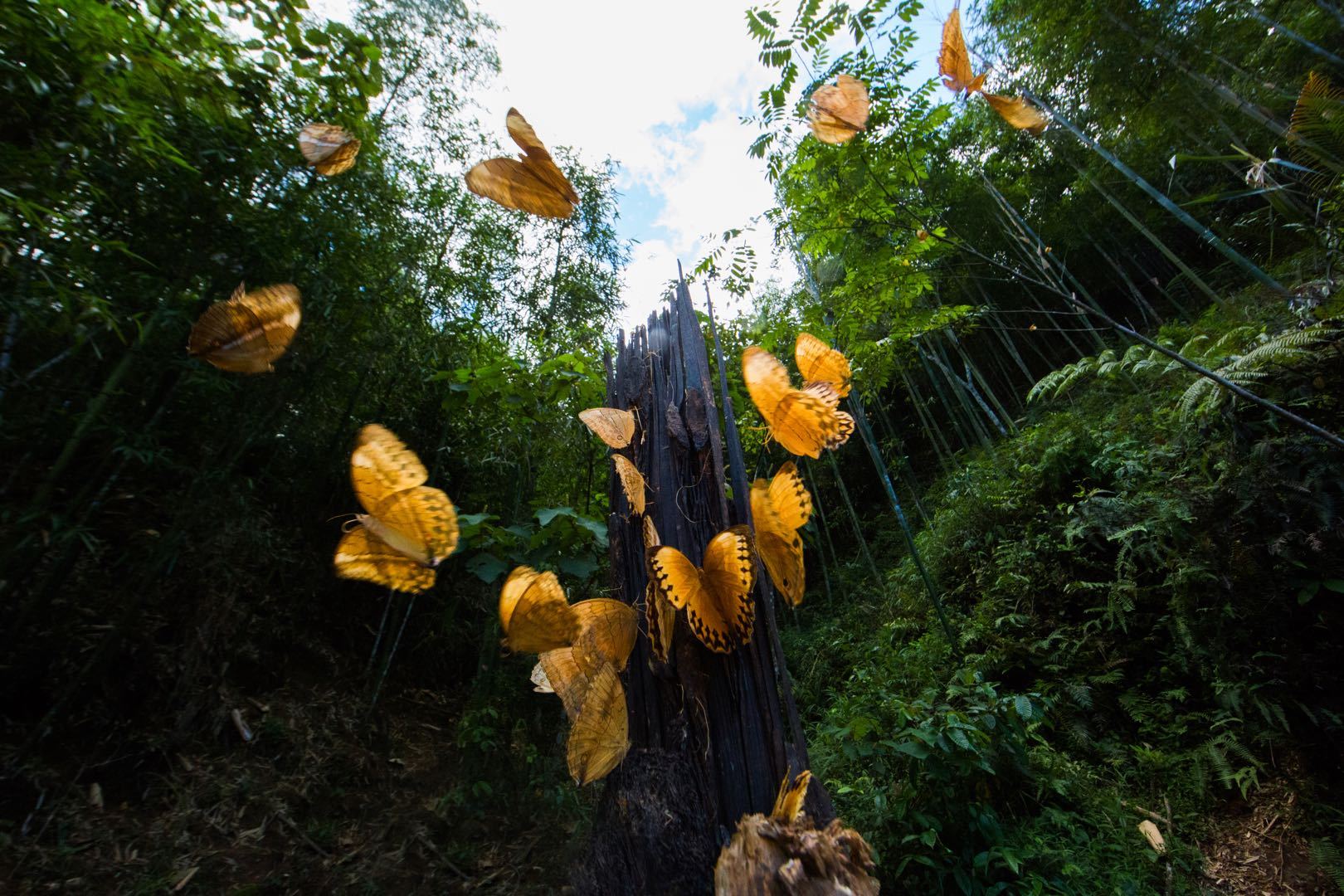 近日,云南省金平县马鞍底乡亿只白袖箭环蝶集中爆发,只要走进观赏点,蝴蝶就会围着游客飞舞。只要你手上蘸一点米酒,蝴蝶就会飞到你的手上。涧水悠悠白云舞,蝴蝶翩翩漫天飞,形成了一道亮丽的自然奇观。