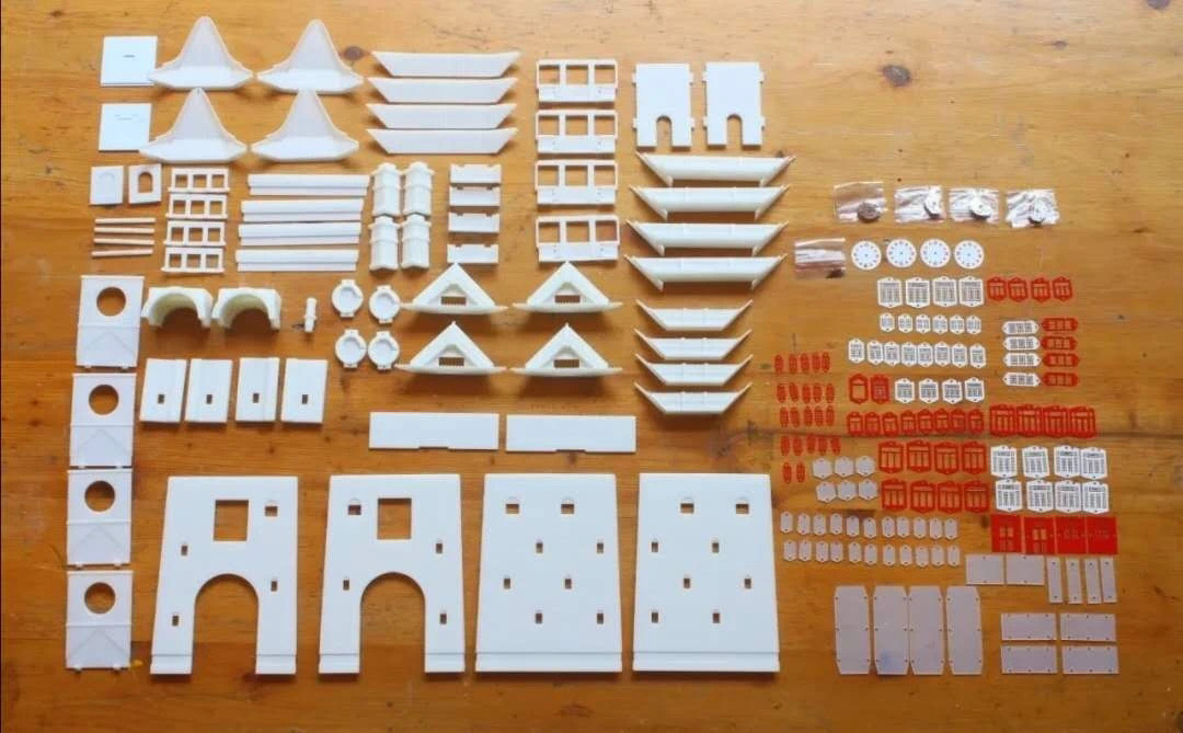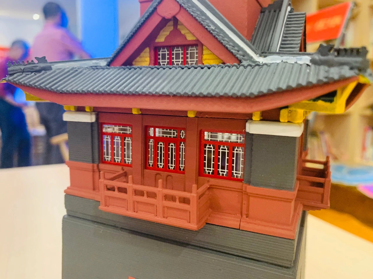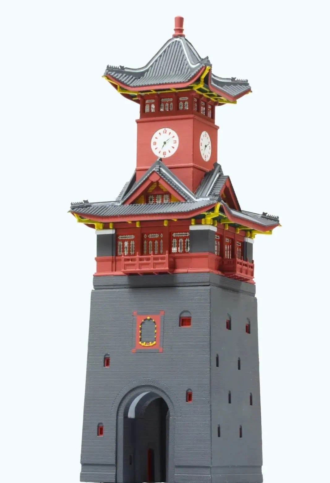 整个模型高38厘米,按照1:87的比例缩小,由273个高精度3D打印和激光切割零件装配而成。模型的屋檐墙角、红砖青瓦、雕栏玉砌……每一处细节都做到了精美还原,与真实的钟楼别无二致。