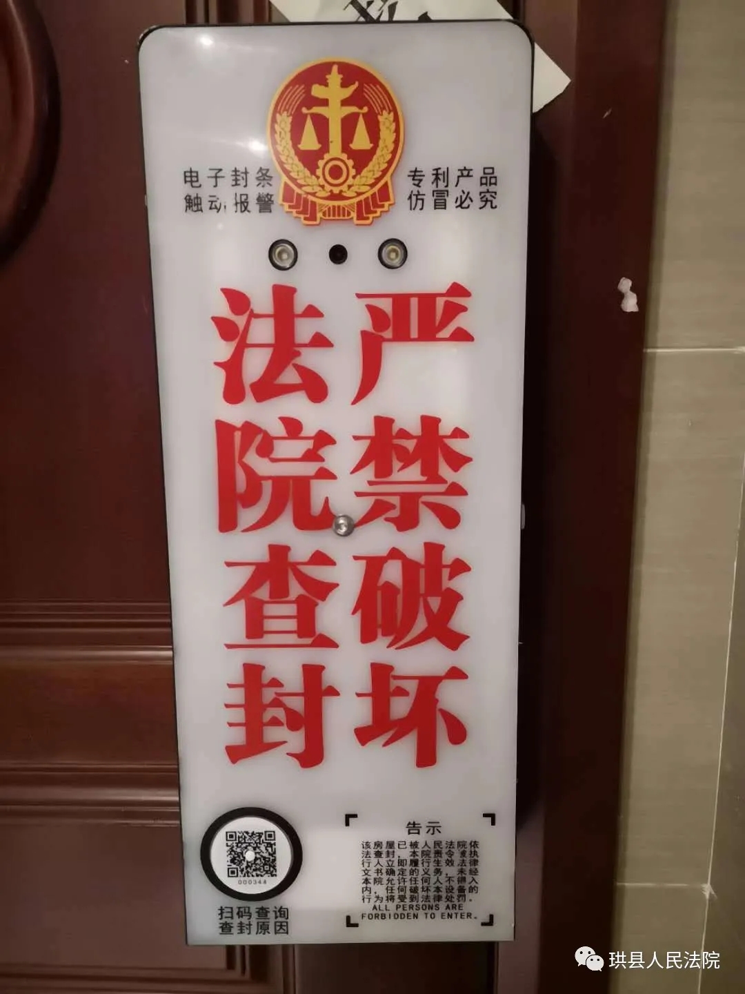 查封现场,法院执行干警只用了短短两分钟时间,就将这一“电子封条”安装调试完成。“电子封条”上印有法徽、“法院查封”“严禁破坏”等字样,十分醒目。