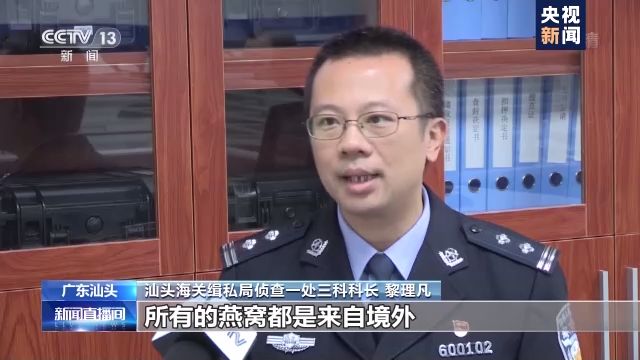 汕头海关缉私局侦查一处三科科长 黎理凡:中国境内是没有燕窝出产的,所有的燕窝都是来自境外。