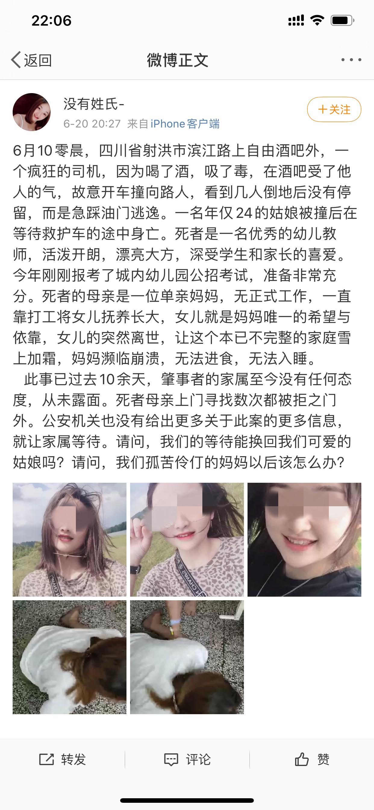 十天后,20日晚,死者家属网上发帖,称肇事者当晚吸毒、饮酒驾车,故意冲撞行人后逃逸。公安机关未给出明确答复,肇事者家属也从未露面。