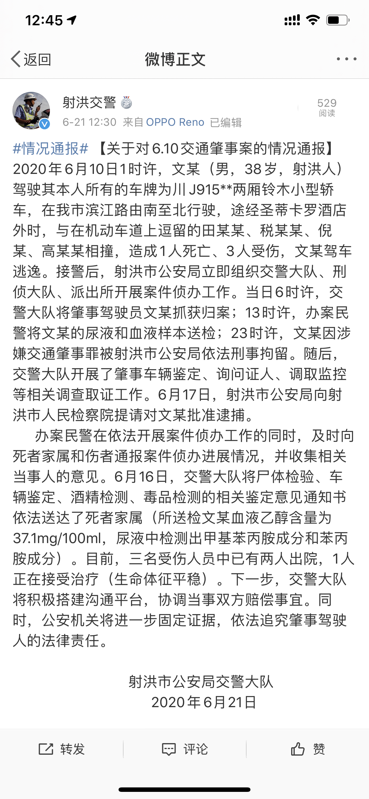 21日,射洪警方发布通报称,肇事司机涉嫌酒驾肇事逃逸,已对检察院提请对司机文某批准逮捕。