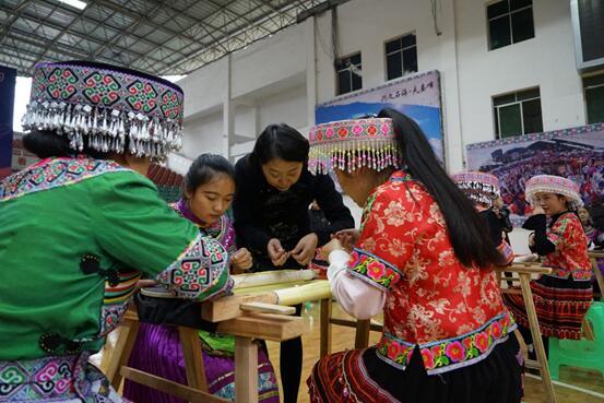 2017年以来,四川实施百名工艺美术大师扶贫三年行动计划》,以“绣花功夫”推进精准扶贫精准脱贫,促进贫困地区经济发展。图为四川省工艺美术大师白桦在宜宾市兴文县为贫困群众培训刺绣技艺。
