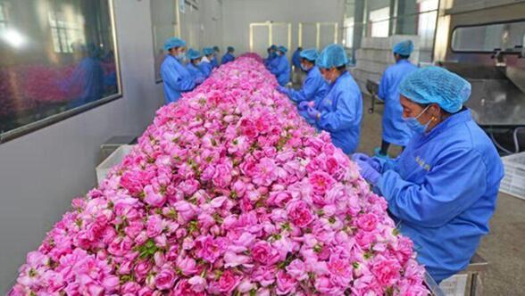 图为夹金山清多香野生资源有限责任公司玫瑰花茶分选扶贫车间。