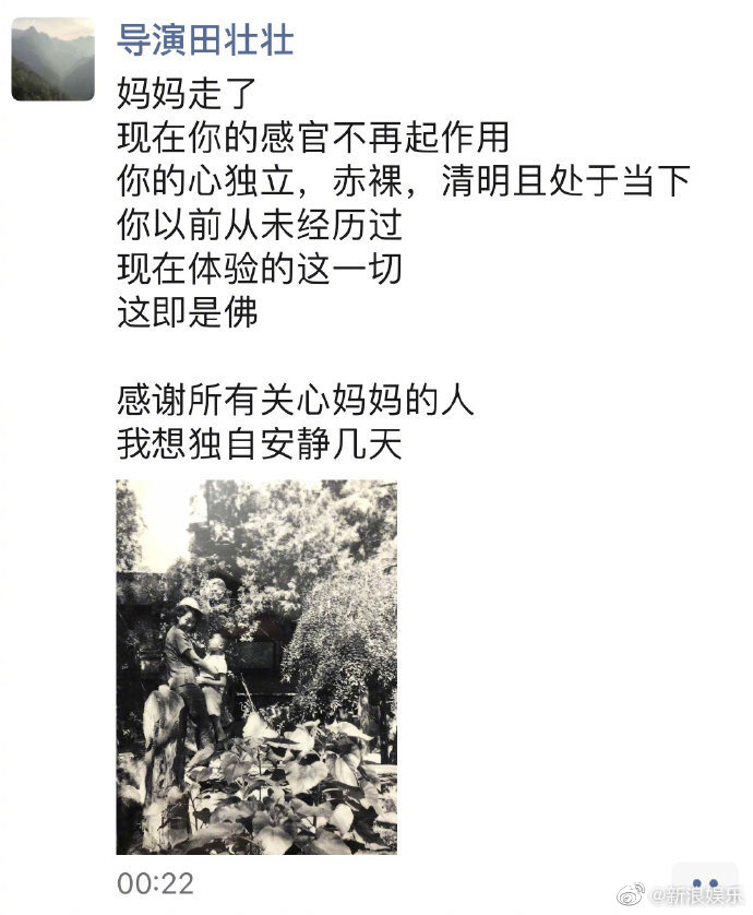 田壮壮导演在朋友圈写道:“妈妈走了,现在你的感官不再起作用,你的心独立,赤裸,清明且处于当下,你以前从未经历过,现在经历的一切,这即是佛。感谢所有关心妈妈的人,我想独自安静今天。”