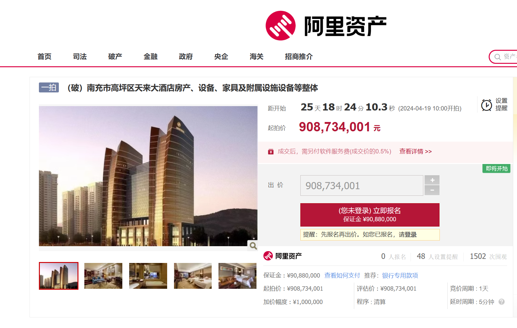 根据《拍卖公告》,此次南充天来酒店及写字楼整体拍卖。起拍价90873.4001万元,保证金9088万元,增价幅度为100万元及其整数倍。将于4月19日10时至4月20日10时,在淘宝网阿里拍卖破产强清平台进行整体公开拍卖。