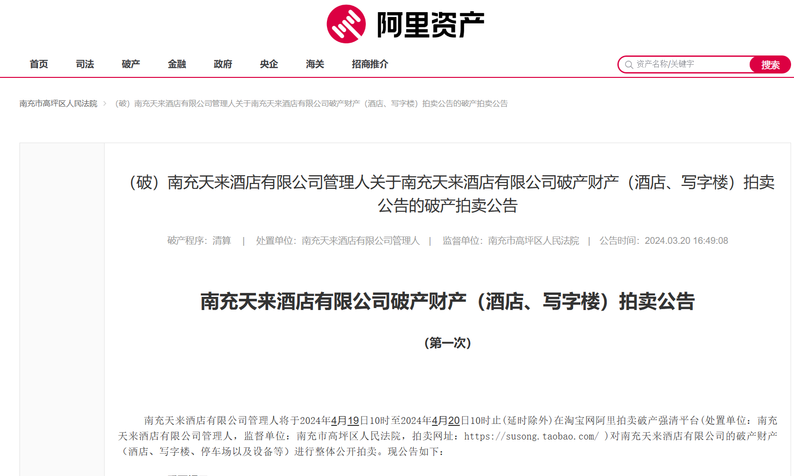 根据阿里资产官方平台发布的《南充天来酒店有限公司破产财产(酒店、写字楼)拍卖公告》(以下简称“拍卖公告”) ,本批次的拍卖标的,均为南充天来酒店有限公司的破产财产。