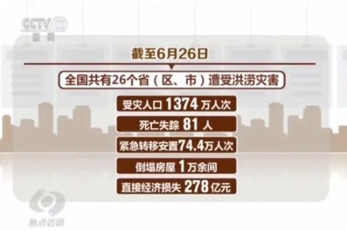 六月份进入主汛期以来,我国南方经历了五轮强降雨过程。据央视焦点访谈报道,截至6月26日,全国共有26个省区市遭受洪涝灾害,受灾人口1374万人次,死亡失踪81人,紧急转移安置74.4万人次,倒塌房屋1万余间,直接经济损失278亿元。国家防总日前表示,当前我国已全面进入汛期,防汛抗洪进入关键阶段。