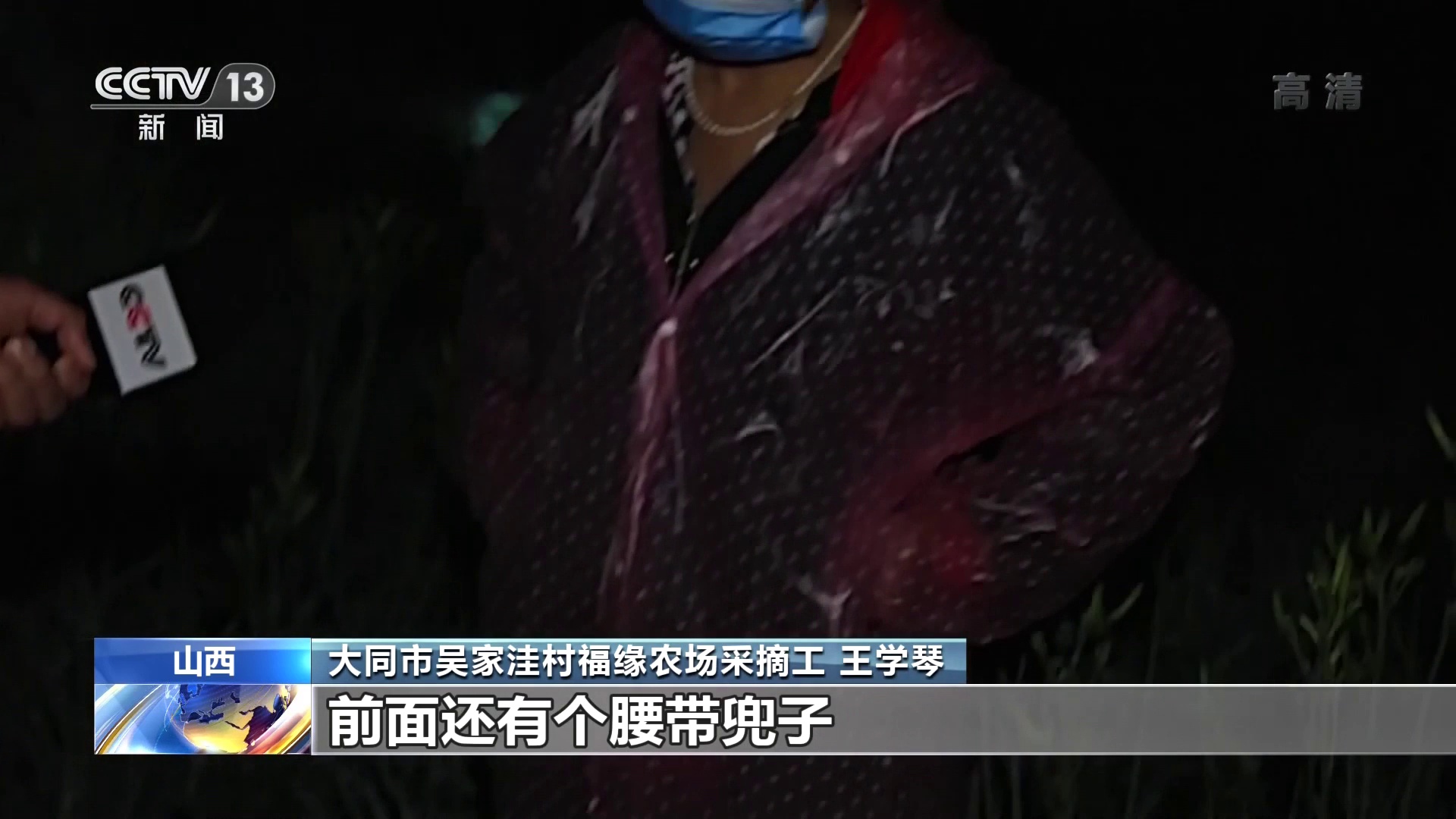 大同市吴家洼村福缘农场采摘工 王学琴:我们采的时候露水挺大,水鞋、雨裤、雨衣,以防下雨和露水,前面还有个腰带兜子。