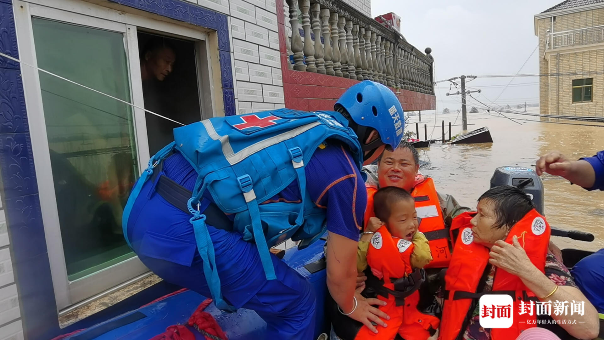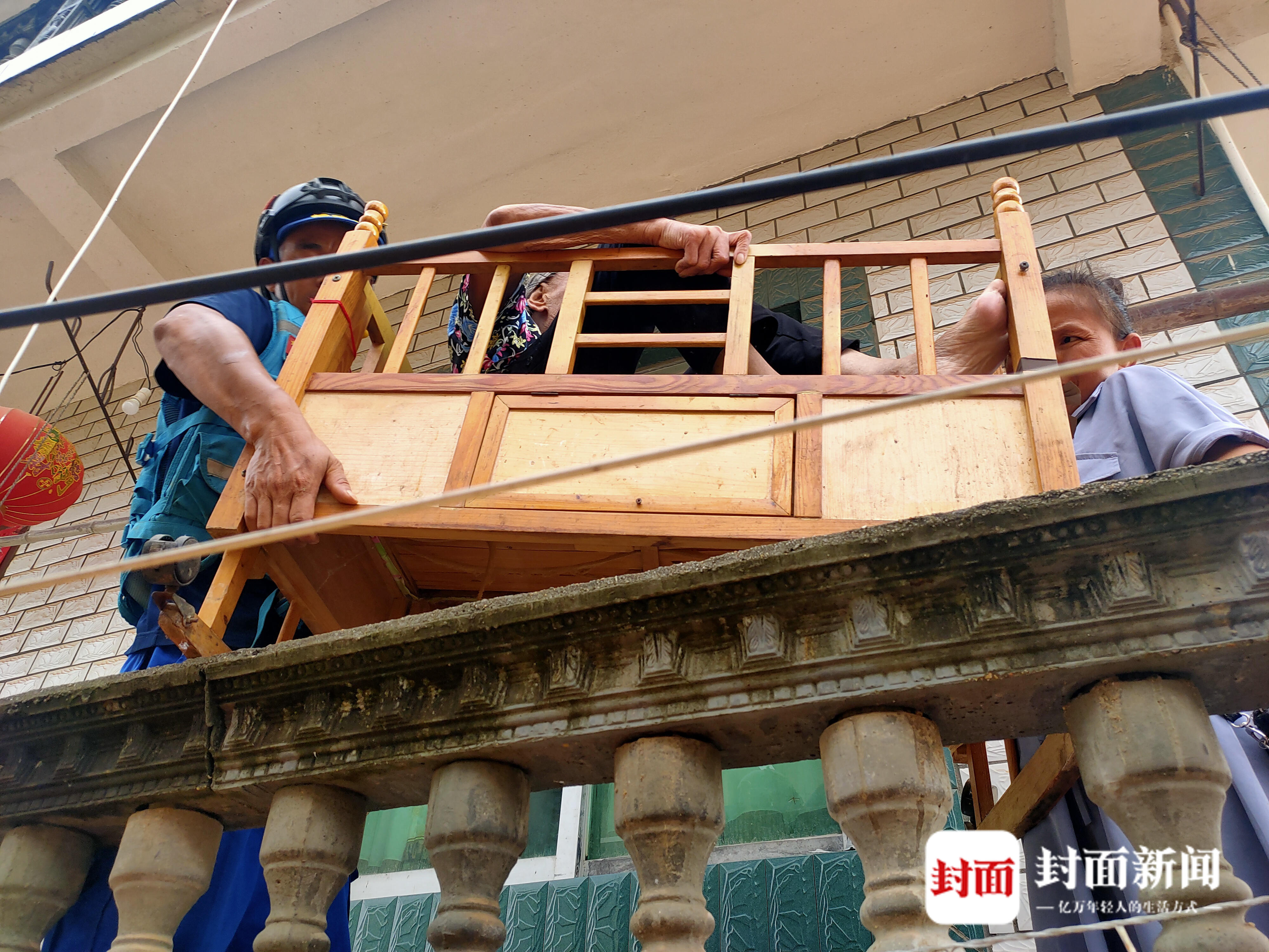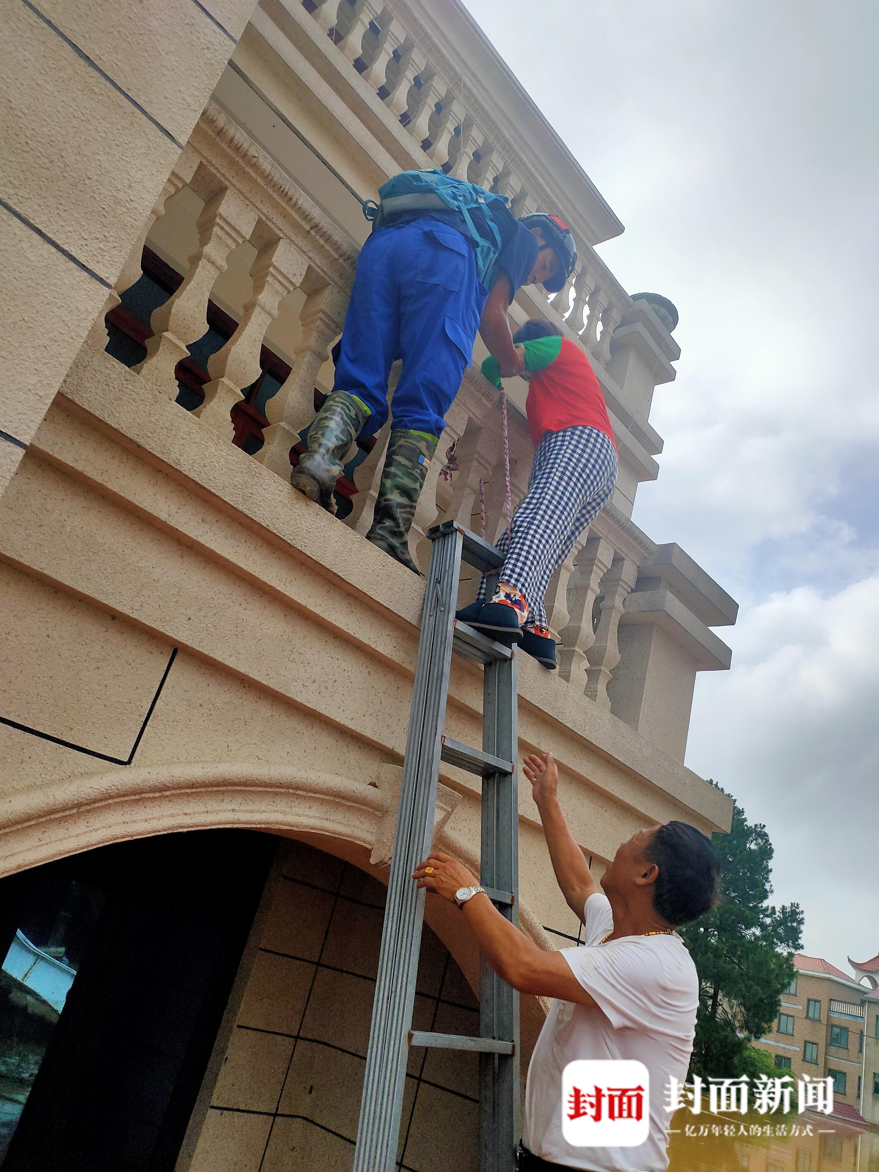 救援人员将困在楼上的群众救出。