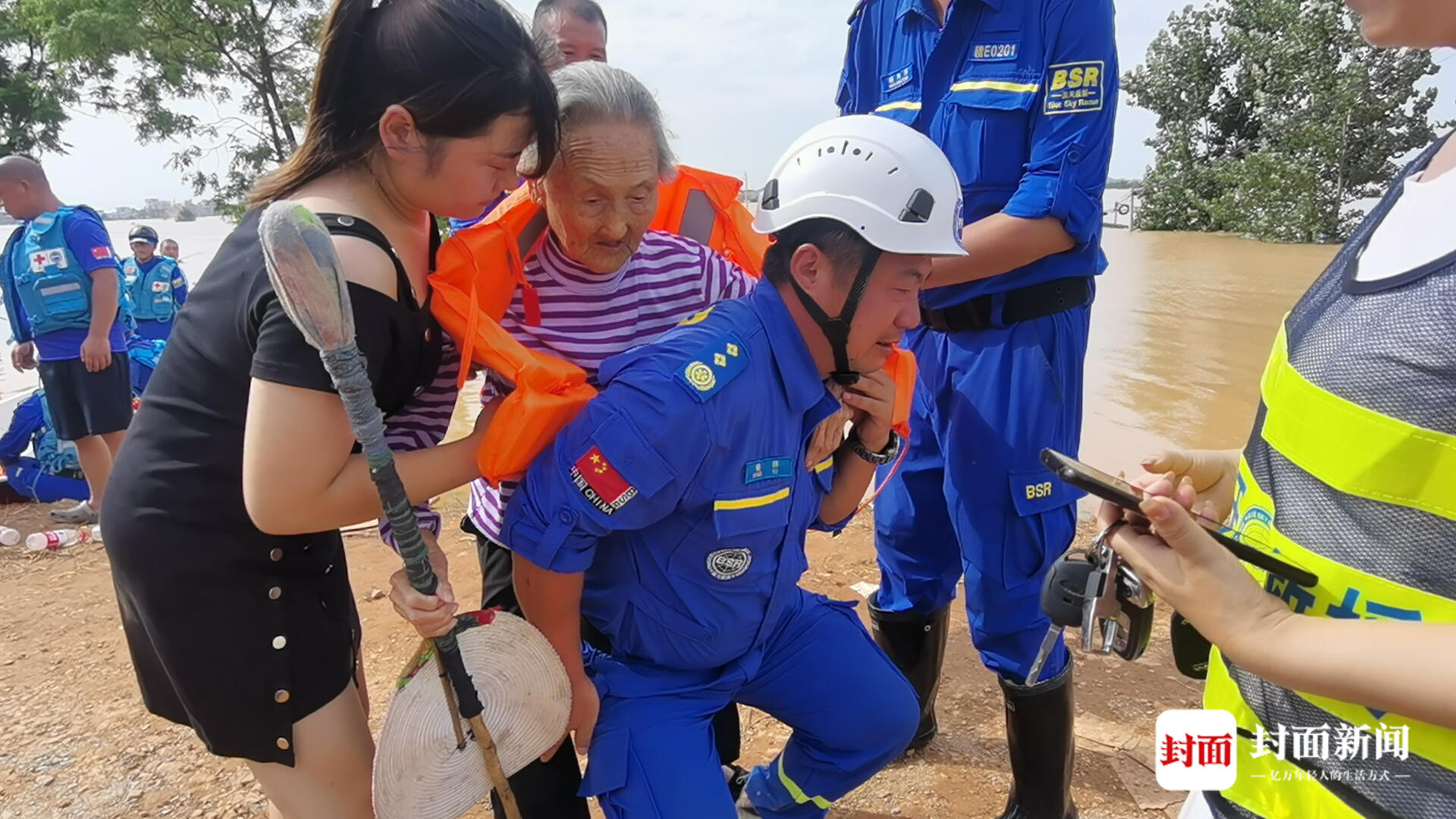 蓝天救援队队员将一名老人背离危险区。