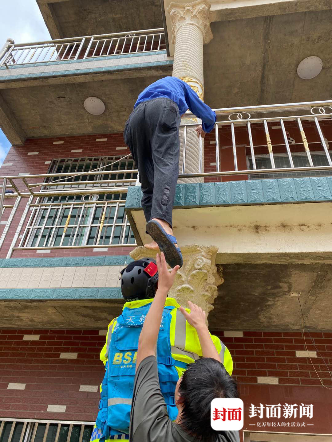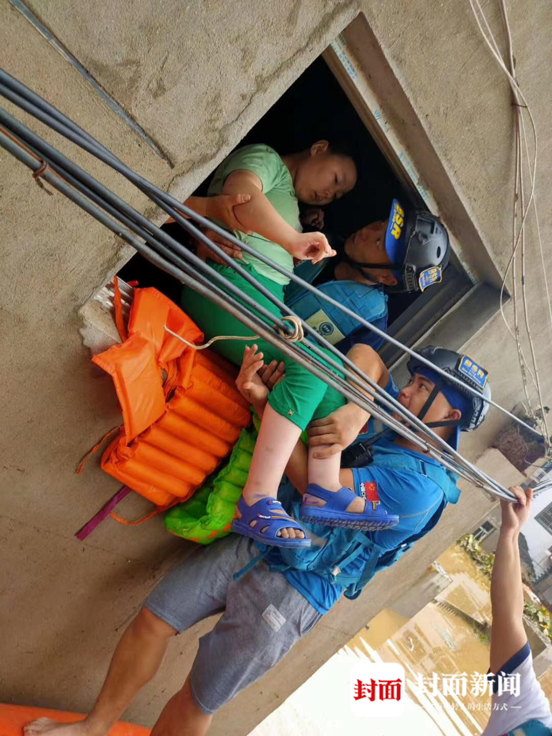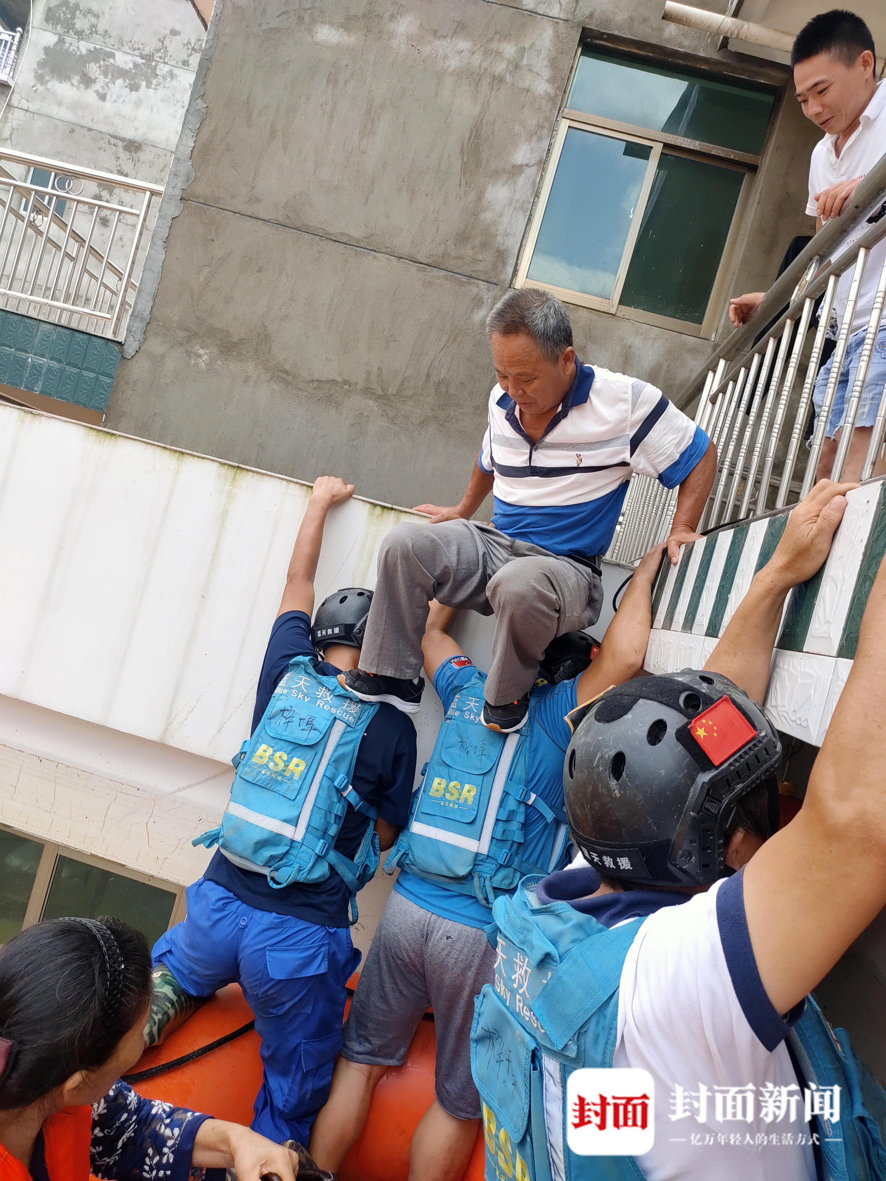 图为蓝天救援队将被困群众从楼上解救下来。