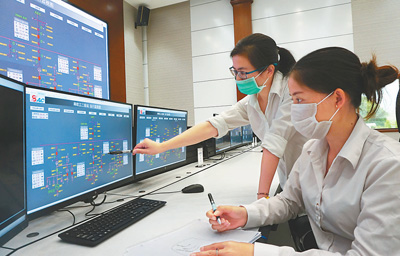 在老挝南欧江梯级水电站集控中心,中老两国员工监测发电站设备运行,进行电力和水情管理。 本报记者 孙广勇摄