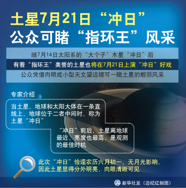 继7月14日太阳系的“大个子”木星“冲日”后,有着“指环王”美誉的土星也将在7月21日上演“冲日”好戏,公众凭借肉眼或小型天文望远镜可一睹土星的靓丽风采。