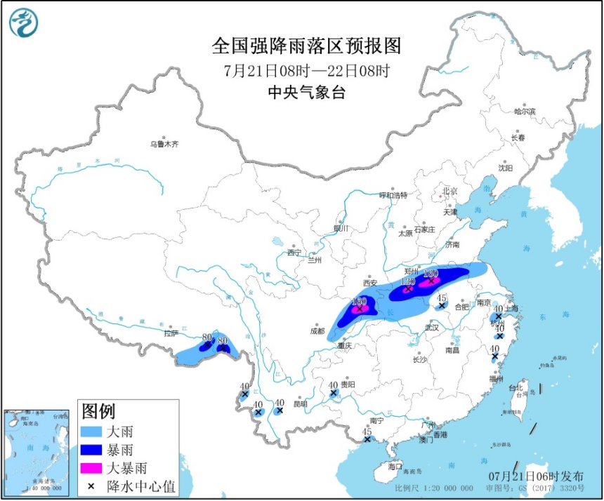 人民网北京7月21日电 据中央气象台网站消息,中央气象台7月21日06时发布暴雨蓝色预警:
