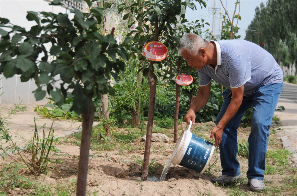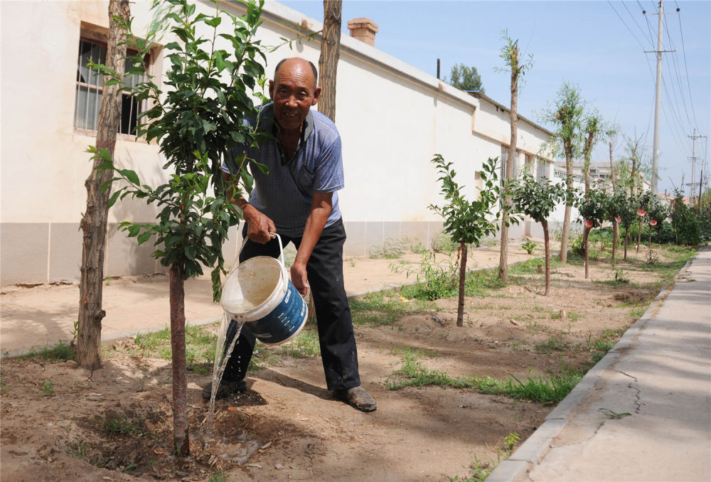 正在浇树的村民王忠明说:“前几年我种了榆树,今年又补种了果树,既能乘凉,又能吃水果,一举两得。”