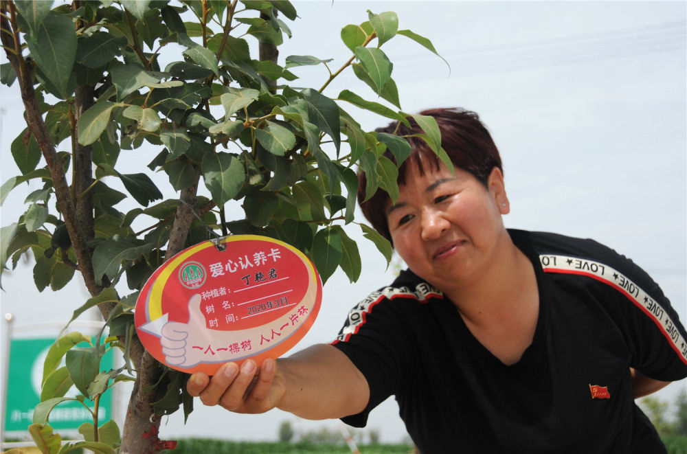 村妇联主任丁艳君说:“为了增加大家管护树木的责任感和荣誉感,我们在树上挂了爱心认养卡,时刻提醒村民照顾好自己的树苗,这些被认养的树苗全部成活,没有一棵受到损伤。”