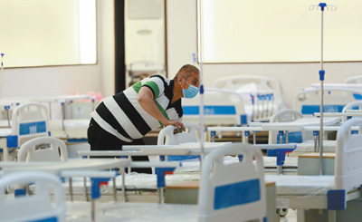 为应对病例激增情况,伊拉克首都巴格达国际展览中心和体育馆被改造成方舱医院。图为6月20日,工作人员在为方舱医院准备病床。