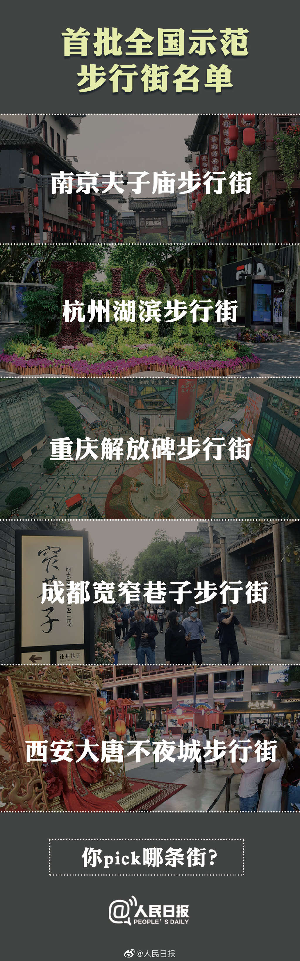 7月22日,商务部公布首批5家全国示范步行街名单:南京夫子庙步行街、杭州湖滨步行街、重庆解放碑步行街、成都宽窄巷子步行街和西安大唐不夜城步行街。5条步行街都是当地著名“网红地标”,每年吸引大量游客打卡。你pick哪条街?