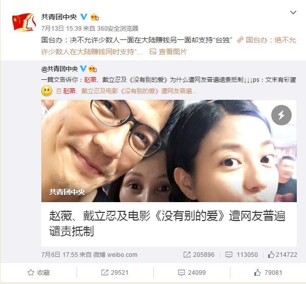 共青团中央官方微博发表长微博《赵薇、戴立忍及电影〈没有别的爱〉遭网友普遍谴责抵制》评论此事。