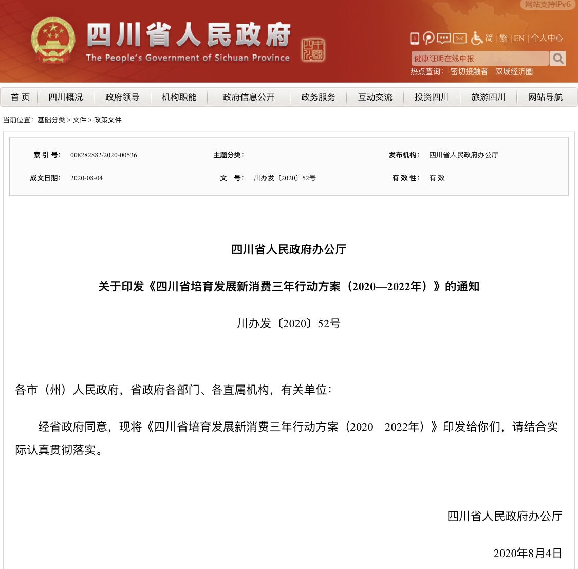 8月4日,封面新闻记者从四川省人民政府官网获悉,四川省人民政府办公厅最新印发《四川省培育发展新消费三年行动方案(2020-2022年)》(以下简称《方案》),通过部署“七大消费行动”,促进消费扩容提质,不断提升消费对经济增长的拉动力。