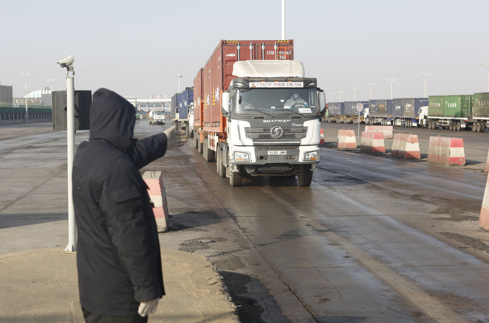 工作人员引导入境货车进入海关监管区。 新华社记者李云平 摄